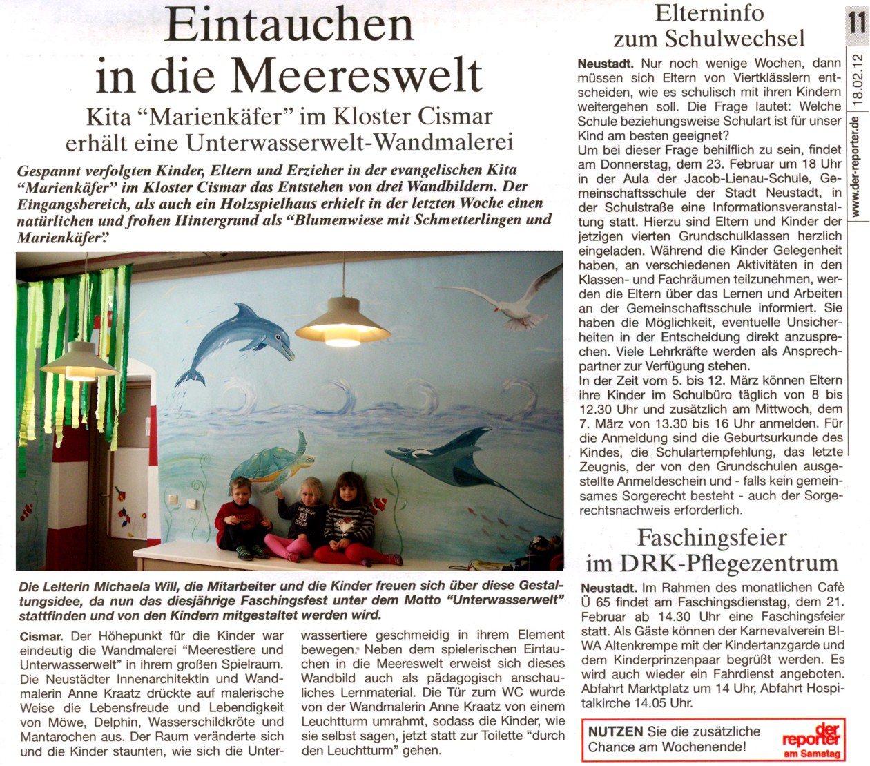 Fassadenmalerei im Kindergarten Pressetext 1 Wandmalerei "Meerestiere und Unterwasserwelt" Ev. Kita Marienkäfer, Kloster Cismar Februar 2012 |